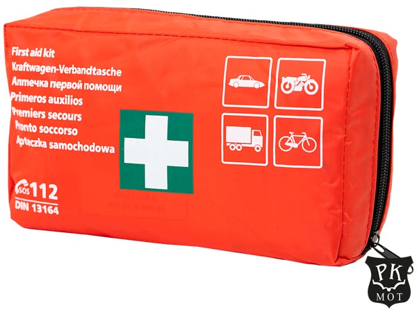 Apteczka pierwszej pomocy, samochodowa.- wykonana z tkaniny wodoodpornej- rzep mocujący do tapicerki- wyposażenie zgodne z normą DIN 13164:2022- plaster na szpulce 5m x 2,5cm – 1 szt.- zestaw plastrów – 14 szt. (6x10 cm (4 szt.), 4,3x7,2 cm (2 szt.), 12x2 cm (2 szt.), 1,9x7,2 cm (2 szt.), 2,5x7,2 cm (4 szt.))- bandaż elastyczny 4m x 6cm – 2 szt.- bandaż elastyczny 4m x 8cm – 3 szt.- rękawiczki jednorazowe winylowe – 4 szt./ 2 pary- chusta opatrunkowa 60x80 cm – 1 szt.- bandaż z kompresem (opatrunek indywidualny) 6x8 cm – 1 szt.- bandaż z kompresem (opatrunek indywidualny) 8x10 cm – 2 szt.- bandaż z kompresem (opatrunek indywidualny) 10x12 cm – 1 szt.- kompres na rany 10x10 cm – 6 szt./3 opak.- chusta trójkątna o wymiarach: 96x96x136 cm – 1 szt.- koc termiczny – 1 szt.- maska medyczna - 2 szt.- nożyczki – 1 szt.- chusteczki nasączone – 2 szt.- instrukcja udzielania pierwszej pomocy – 1 szt.- wymiary apteczki: 21,5x12,5x6 cm