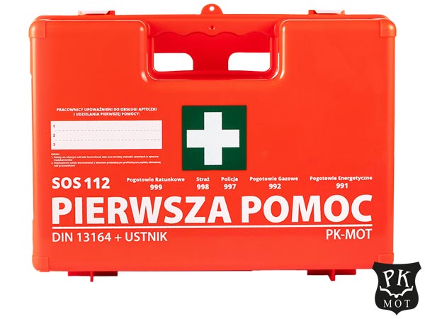 Przenośna apteczka pierwszej pomocy, zakładowa.- wykonana z tworzywa sztucznego (ABS)- wyposażenie zgodne z normą DIN 13164:2022- plaster na szpulce 5m x 2,5cm – 1 szt.- zestaw plastrów – 14 szt.( 6x10 cm (4 szt.), 4,3x7,2 cm (2 szt.), 12x2 cm (2 szt.), 1,9x7,2 cm (2 szt.), 2,5x7,2 cm (4 szt.))- bandaż elastyczny 4m x 6cm – 2 szt.- bandaż elastyczny 4m x 8cm – 3 szt.- rękawiczki jednorazowe winylowe – 4 szt./ 2 pary- chusta opatrunkowa 60x80 cm – 1 szt.- bandaż z kompresem (opatrunek indywidualny) 6x8 cm – 1 szt.- bandaż z kompresem (opatrunek indywidualny) 8x10 cm – 2 szt.- bandaż z kompresem (opatrunek indywidualny) 10x12 cm – 1 szt.- kompres na rany 10x10 cm – 6 szt./3 opak.- chusta trójkątna o wymiarach: 96x96x136 cm – 1 szt.- koc termiczny – 1 szt.- maska medyczna - 2 szt.- nożyczki – 1 szt.- chusteczki nasączone – 2 szt.- instrukcja udzielania pierwszej pomocy – 1 szt.- aparat do sztucznego oddychania- z wieszakiem montowanym na ścianę- przeznaczona do zakładów pracy- wymiary apteczki: 28x21x11,5 cm