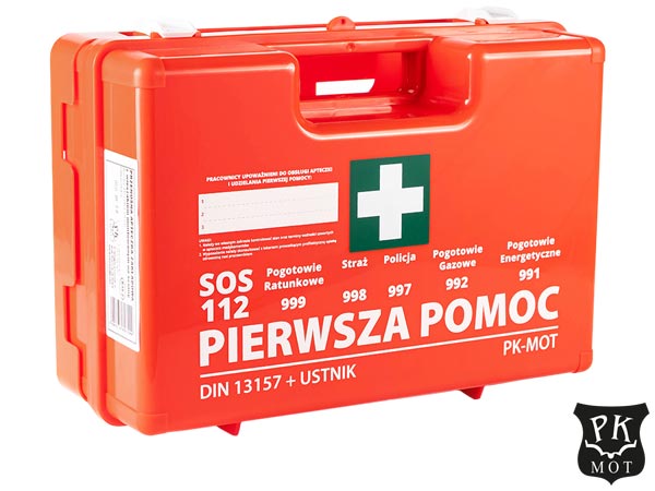Przenośna apteczka pierwszej pomocy, zakładowa.- wykonana z tworzywa sztucznego (ABS)- wyposażenie zgodne z normą DIN 13157:2009- plaster z opatrunkiem 6x10 cm (8 szt.)- plaster na szpulce 5 m x 2,5 cm (1 szt.)- zestaw plastrów, 4 rodzaje- bandaż z kompresem 6x8 cm (1 szt.)- bandaż elastyczny 4 m x 6 cm (2 szt.)- bandaż elastyczny 4 m x 8 cm (2 szt.)- rękawiczki winylowe (2 pary)- chusta opatrunkowa 60x80 cm (1 szt.)- chusta z flizeliny 20x30 cm (5 szt.)- bandaż z kompresem (opatrunek indywidualny) 8x10 cm (3 szt.)- bandaż z kompresem (opatrunek indywidualny) 10x12 cm (1 szt.)- kompres na rany 10x10 cm (6 szt.)- kompres na oko 5x7,5 cm (2 szt.)- zimny kompres (1 szt.)- chusta trójkątna o wymiarach: 96x96x136 cm (2 szt.)- koc termiczny 160x210 cm (1 szt.)- nożyczki 19,5 cm (1 szt.)- torba foliowa (2 szt.)- aparat do sztucznego oddychania- instrukcja pierwsza pomoc w nagłych wypadkach oraz spis wyposażenia- z wieszakiem montowanym na ścianę- przeznaczona do zakładów pracy- wymiary apteczki: 33x24,5x12,5 cm