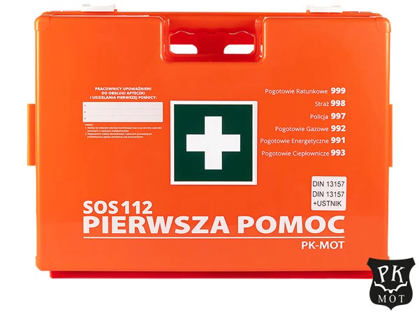Przenośna apteczka pierwszej pomocy, zakładowa.- wykonana z tworzywa sztucznego (ABS)- wyposażenie zgodne z normą DIN 13164 oraz DIN 13157:2009- zestaw plastrów z opatrunkiem: 6x10 cm (12 szt.), 4,3x7,2 cm (2 szt.), 12x2 cm (2 szt.), 1,9x7,2 cm (2 szt.), 2,5x7,2 cm (4 szt.)- plaster na szpulce 5 m x 2,5 cm (2 szt.)- zestaw plastrów, 4 rodzaje- bandaż z kompresem 6x8 cm (1 szt.)- bandaż elastyczny 4 m x 6 cm (4 szt.)- bandaż elastyczny 4 m x 8 cm (5 szt.)- rękawiczki winylowe (4 pary)- chusteczki nasączone (2 szt.)- chusta opatrunkowa 60x80 cm (2 szt.)- chusta opatrunkowa 60x40 cm (1 szt.)- chusta z flizeliny 20x30 cm (5 szt.)- bandaż z kompresem (opatrunek indywidualny) 6x8 cm (1 szt.)- bandaż z kompresem (opatrunek indywidualny) 8x10 cm (5 szt.)- bandaż z kompresem (opatrunek indywidualny) 10x12 cm (2 szt.)- kompres na rany 10x10 cm (12 szt.)- kompres na oko 5x7,5 cm (2 szt.)- zimny kompres (1 szt.)- chusta trójkątna 96x96x136 cm (4 szt.)- koc termiczny 160x210 cm (2 szt.)- nożyczki 14,5 cm i 19,5 cm (2 szt.)- torba foliowa (2 szt.)- aparat do sztucznego oddychania- instrukcja pierwsza pomoc w nagłych wypadkach oraz spis wyposażenia- z wieszakiem montowanym na ścianę- przeznaczona do zakładów pracy- wymiary apteczki:41x30x15