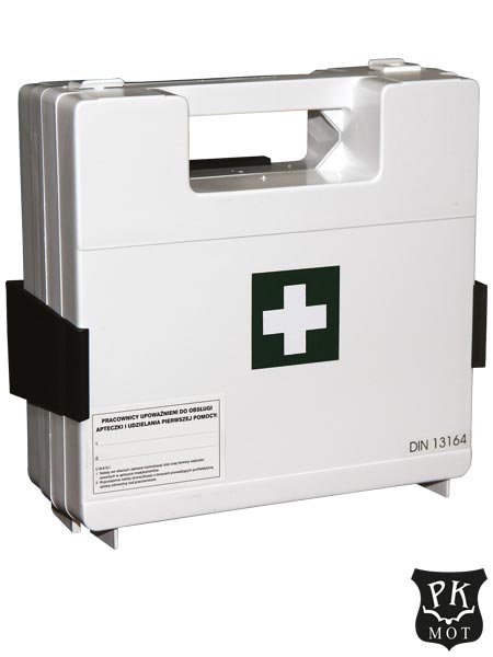 Apteczka pierwszej pomocy z rączką, zakładowa.- wykonana z tworzywa sztucznego (polistyren)- wyposażenie zgodne z normą DIN 13164:2022- plaster na szpulce 5m x 2,5cm – 1 szt.- zestaw plastrów – 14 szt. (6x10 cm (4 szt.), 4,3x7,2 cm (2 szt.), 12x2 cm (2 szt.), 1,9x7,2 cm (2 szt.), 2,5x7,2 cm (4 szt.))- bandaż elastyczny 4m x 6cm – 2 szt.- bandaż elastyczny 4m x 8cm – 3 szt.- rękawiczki jednorazowe winylowe – 4 szt./ 2 pary- chusta opatrunkowa 60x80 cm – 1 szt.- bandaż z kompresem (opatrunek indywidualny) 6x8 cm – 1 szt.- bandaż z kompresem (opatrunek indywidualny) 8x10 cm – 2 szt.- bandaż z kompresem (opatrunek indywidualny) 10x12 cm – 1 szt.- kompres na rany 10x10 cm – 6 szt./3 opak.- chusta trójkątna o wymiarach: 96x96xx136 cm – 1 szt.- koc termiczny – 1 szt.- maska medyczna - 2 szt.- nożyczki – 1 szt.- chusteczki nasączone – 2 szt.- instrukcja udzielania pierwszej pomocy – 1 szt.- aparat do sztucznego oddychania - 1 szt.- walizka z możliwością zawieszenia na ścianie- wymiary apteczki: 10,5x24x24 cm