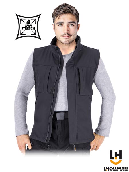 Bezrękawnik ochronny, męski.- trójwarstwowa tkanina softshell: 4-kierunkowy stretch 94% poliester, 6% elastan, membrana TPU, polar 100% poliester- gramatura 310 g/m2- materiał SOFTSHELL - chroni przed deszczem oraz wiatrem, a jednocześnie pozwala skórze oddychać- 4-kierunkowy stretch - materiał, który rozciąga się we wszystkich kierunkach- zapinany na zamek błyskawiczny z dodatkowym zapięciem na rzepy- kołnierz w formie stójki z możliwością ściągnięcia za pomocą troczka w tylnej partii- dwie kieszenie w dolnej części oraz dwie na klatce piersiowej zapinane na suwak- dół bezrękawnika zakończony ściągaczem w tylnej partii- fason: REGULAR