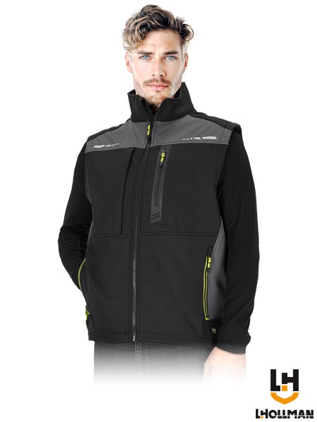 Bezrękawnik ochronny, męski.- trójwarstwowa tkanina softshell o splocie twill: 100% poliester, membrana TPU, polar 100% poliester- gramatura 305 g/m2- materiał SOFTSHELL - chroni przed deszczem oraz wiatrem, a jednocześnie pozwala skórze oddychać- zapinany na zamek błyskawiczny- kołnierz w formie stójki- dwie kieszenie w dolnej części oraz dwie na klatce piersiowej zapinane na suwak- dół bezrękawnika z możliwością ściągnięcia od wewnętrznej strony za pomocą troczków- odblaskowe elementy- fason: REGULAR