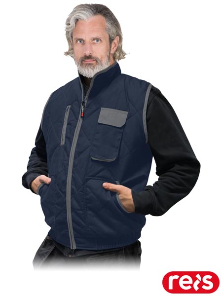 Pikowany bezrękawnik ochronny ocieplany, męski.- tkanina: 65% poliester, 35% bawełna o gramaturze 150 g/m2- wyściółka 100% poliester o gramaturze 160-180 g/m2- podszewka 100% poliester o gramaturze 60 g/m2- zapinany na zamek błyskawiczny- kołnierz w formie stójki- dwie kieszenie w dolnej części oraz jedna na klatce piersiowej na telefon komórkowy- dół bezrękawnika zakończony ściągaczem- fason: REGULAR