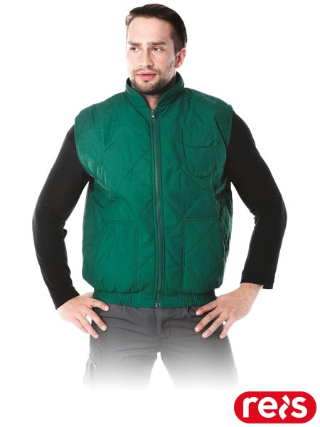 Pikowany bezrękawnik ochronny ocieplany, męski.- tkanina: 65% poliester, 35% bawełna o gramaturze 150 g/m2- wyściółka 100% poliester o gramaturze 160-180 g/m2- podszewka 100% poliester o gramaturze 60 g/m2- zapinany na zamek błyskawiczny- kołnierz w formie stójki- dwie kieszenie w dolnej części oraz jedna na klatce piersiowej na telefon komórkowy- dół bezrękawnika zakończony ściągaczem