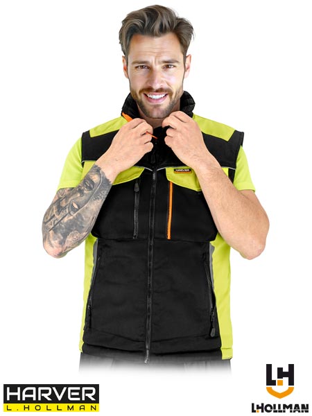 Bezrękawnik ochronny ocieplany, męski.- materiał główny: tkanina 80% poliester 20% bawełna o gramaturze 240 g/m2- kontrastowe wstawki: tkanina 80% poliester, 20% bawełna o gramaturze 240 g/m2- wyściółka 100% poliester o gramaturze 150 g/m2- pikowana podszewka polarowa 100% poliester o gramaturze 150g/m2- zapinany na zamek błyskawiczny- kołnierz w formie stójki ocieplany polarem- dwie kieszenie w dolnej części zapinane na suwak oraz dwie podwójne na klatce piersiowej- dwie kieszenie wewnętrzne, w tym jedna zapinana na suwak, zaś druga na rzep- dół bezrękawnika z możliwością regulacji za pomocą nap- odblaskowe elementy- fason: REGULAR