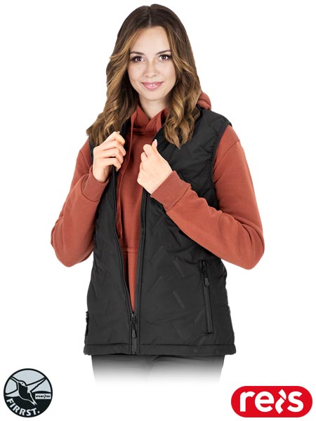 Pikowany bezrękawnik ochronny ocieplany, damski.- tkanina: 100% poliester o gramaturze 83 g/m2- wyściółka 100% poliester o gramaturze 160 g/m2- podszewka 100% poliester o gramaturze 60 g/m2- zapinany na zamek błyskawiczny- kołnierz w formie stójki- dwie kieszenie w dolnej części zapinane na suwak- ramiona bezrękawnika wykończone elastyczną lamówką