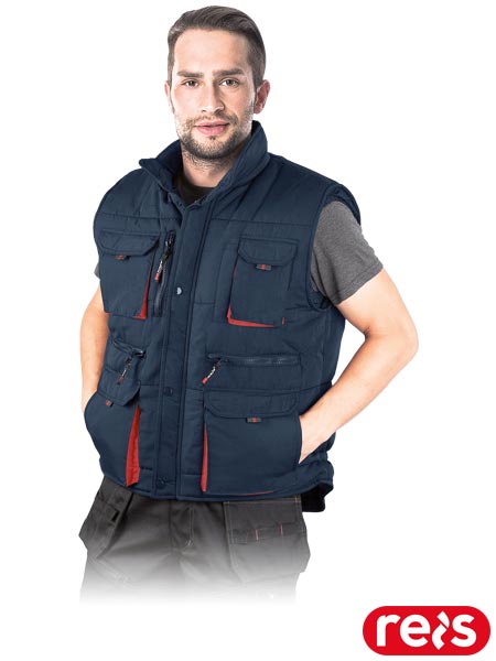 Bezrękawnik ochronny ocieplany, męski.- tkanina: 100% poliester o gramaturze 95 g/m2- wyściółka 100% poliester o gramaturze 220 g/m2- podszewka 100% poliester o gramaturze 60 g/m2- zapinany na zamek błyskawiczny z dodatkowym zapięciem na napy- kołnierz w formie stójki- cztery kieszenie w dolnej części oraz trzy na klatce piersiowej, w tym jedna na telefon komórkowy oraz dodatkowa przegródka np. na długopis- kieszeń wewnętrzna zapinana na rzep- ramiona bezrękawnika zakończone ściągaczem zabezpieczającym przed dostawaniem się wiatru- przedłużany tył- duża ilość kieszeni pomieści akcesoria wędkarzy, narzędzia montażysty, jak i przybory domowego majstra