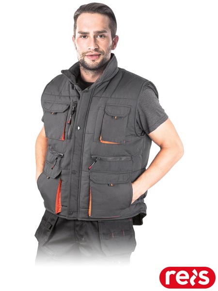 Bezrękawnik ochronny ocieplany, męski.- tkanina: 100% poliester o gramaturze 95 g/m2- wyściółka 100% poliester o gramaturze 220 g/m2- podszewka 100% poliester o gramaturze 60 g/m2- zapinany na zamek błyskawiczny z dodatkowym zapięciem na napy- kołnierz w formie stójki- cztery kieszenie w dolnej części oraz trzy na klatce piersiowej, w tym jedna na telefon komórkowy oraz dodatkowa przegródka np. na długopis- kieszeń wewnętrzna zapinana na rzep- ramiona bezrękawnika zakończone ściągaczem zabezpieczającym przed dostawaniem się wiatru- przedłużany tył- duża ilość kieszeni pomieści akcesoria wędkarzy, narzędzia montażysty, jak i przybory domowego majstra