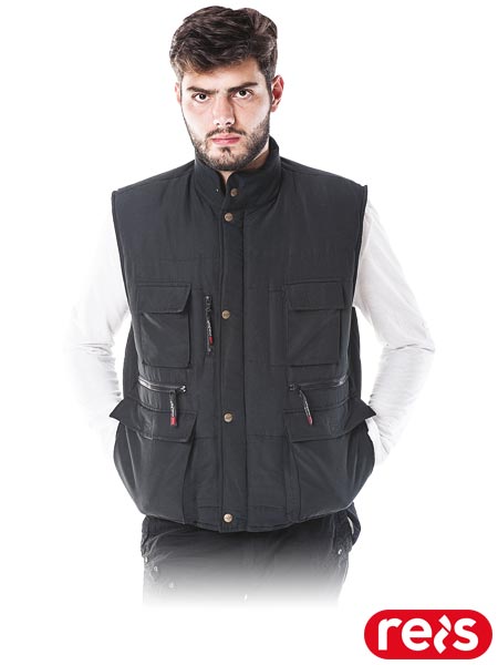Bezrękawnik ochronny ocieplany.- tkanina: 100% poliester o gramaturze 95 g/m2- wyściółka 100% poliester o gramaturze 220 g/m2- podszewka 100% poliester o gramaturze 60 g/m2- zapinany na zamek błyskawiczny z dodatkowym zapięciem na napy- kołnierz w formie stójki- cztery kieszenie w dolnej części oraz trzy na klatce piersiowej, w tym jedna na telefon komórkowy oraz dodatkowa przegródka np. na długopis- kieszeń wewnętrzna zapinana na rzep- ramiona bezrękawnika zakończone ściągaczem zabezpieczającym przed dostawaniem się wiatru- przedłużany tył- duża ilość kieszeni pomieści akcesoria wędkarzy, narzędzia montażysty, jak i przybory domowego majstra
