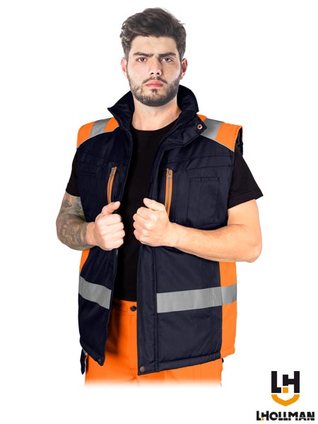 Bezrękawnik ochronny ocieplany, męski.- tkanina: 100% poliester powlekany poliuretanem o gramaturze 180 g/m2- wyściółka 100% poliester o gramaturze 280 g/m2- podszewka 100% poliester tafta 210T o gramaturze 60 g/m2- zapinany na zamek błyskawiczny z dodatkowym zapięciem na rzepy- kołnierz w formie stójki- dwie kieszenie w dolnej części bezrękawnika oraz dwie kieszenie na klatce piersiowej z dodatkowymi przegródkami na akcesoria- wewnętrzna kieszeń zapinana na rzep- pasy odblaskowe zapewniające widoczność