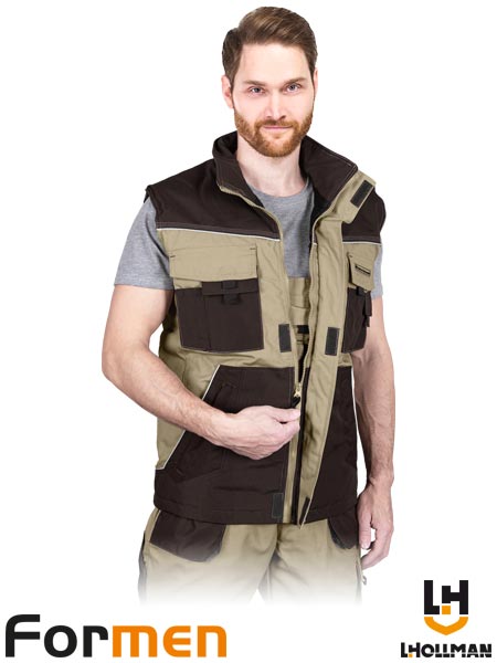Bezrękawnik ocieplany FORMEN.- powłoka 65% poliester, 35% bawełna o gramaturze 270 g/m2- wyściółka 100% poliester o gramaturze 130 g/m2- podszewka 100% poliester typu tafta 190T o gramaturze 50 g/m2- zapinany na suwak z dodatkowymi zapięciem na rzepy- trzy kieszenie na klatce piersiowej, w tym dwie na suwak i jedna na telefon, jedna wąska kieszonka na przybory np. długopis oraz dwie dolne- końcówka do przypięcia kluczy- pętelki umożliwiające doczepienie dodatkowych akcesoriów- na ramionach bezrękawnika wzmocnienie z czarnego materiału, co zwiększa jego wytrzymałość na przetarcia- staranne wykonanie oraz zwiększona wytrzymałość zapewniają wysoki komfort użytkowania- certyfikat OEKO-TEX® Standard 100 (testy na zawartość szkodliwych dla zdrowia substancji)