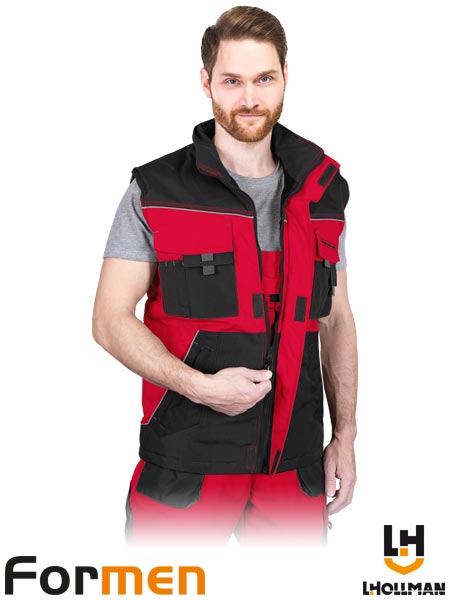 Bezrękawnik ocieplany FORMEN.- powłoka 65% poliester, 35% bawełna o gramaturze 270 g/m2- wyściółka 100% poliester o gramaturze 130 g/m2- podszewka 100% poliester typu tafta 190T o gramaturze 50 g/m2- zapinany na suwak z dodatkowymi zapięciem na rzepy- trzy kieszenie na klatce piersiowej, w tym dwie na suwak i jedna na telefon, jedna wąska kieszonka na przybory np. długopis oraz dwie dolne- końcówka do przypięcia kluczy- pętelki umożliwiające doczepienie dodatkowych akcesoriów- na ramionach bezrękawnika wzmocnienie z czarnego materiału, co zwiększa jego wytrzymałość na przetarcia- staranne wykonanie oraz zwiększona wytrzymałość zapewniają wysoki komfort użytkowania- certyfikat OEKO-TEX® Standard 100 (testy na zawartość szkodliwych dla zdrowia substancji)
