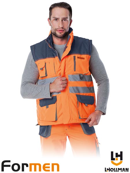 Bezrękawnik ochronny ocieplany FORMEN, męski.- tkanina: 80% poliester, 20% bawełna (kolory CSB i CGS: 100% poliester) o gramaturze 270 g/m2- wyściółka 100% poliester o gramaturze 130 g/m2- podszewka 100% poliester typu tafta 190T o gramaturze 50 g/m2- zapinany na suwak z dodatkowymi zapięciem na rzepy- trzy kieszenie na klatce piersiowej, w tym dwie na suwak i jedna na telefon, jedna wąska kieszonka na przybory np. długopis oraz dwie dolne- końcówka do przypięcia kluczy- pętelki umożliwiające doczepienie dodatkowych akcesoriów- na ramionach bezrękawnika wzmocnienie z szarego materiału, co zwiększa jego wytrzymałość na przetarcia- staranne wykonanie oraz zwiększona wytrzymałość zapewniają wysoki komfort użytkowania- testowane na zawartość szkodliwych dla zdrowia substancji zgodnie ze standardami OEKO-TEX® Standard 100- materiał i pasy testowane zgodnie z normą EN ISO 20471