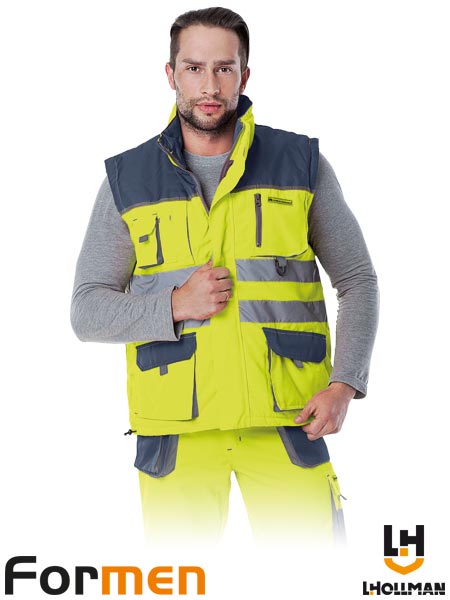 Bezrękawnik ochronny ocieplany FORMEN, męski.- tkanina: 80% poliester, 20% bawełna (kolory CSB i CGS: 100% poliester) o gramaturze 270 g/m2- wyściółka 100% poliester o gramaturze 130 g/m2- podszewka 100% poliester typu tafta 190T o gramaturze 50 g/m2- zapinany na suwak z dodatkowymi zapięciem na rzepy- trzy kieszenie na klatce piersiowej, w tym dwie na suwak i jedna na telefon, jedna wąska kieszonka na przybory np. długopis oraz dwie dolne- końcówka do przypięcia kluczy- pętelki umożliwiające doczepienie dodatkowych akcesoriów- na ramionach bezrękawnika wzmocnienie z szarego materiału, co zwiększa jego wytrzymałość na przetarcia- staranne wykonanie oraz zwiększona wytrzymałość zapewniają wysoki komfort użytkowania- testowane na zawartość szkodliwych dla zdrowia substancji zgodnie ze standardami OEKO-TEX® Standard 100- materiał i pasy testowane zgodnie z normą EN ISO 20471