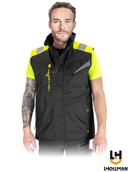 Bezrękawnik ochronny ocieplany, męski.- tkanina rip-stop: 100% poliester Oxford powlekany poliuretanem o gramaturze 210 g/m2- wyściółka 100% poliester o gramaturze 120 g/m2- pikowana podszewka 100% poliester tafeta o gramaturze 60 g/m2- tkanina typu rip-stop - zabezpiecza przed rozdarciem w momencie zaczepienia o wystający przedmiot- zapinany na zamek błyskawiczny z dodatkowym zapięciem na rzepy- kołnierz w formie stójki- dwie kieszenie w dolnej części zapinane na suwak oraz dwie na klatce piersiowej, w tym jedna zapinana na suwak, zaś druga na rzep- kieszeń wewnętrzna zapinana na rzep- dół bezrękawnika z możliwością ściągnięcia od wewnętrznej strony za pomocą troczków- odblaskowe elementy zwiększające widoczność- fason: REGULAR