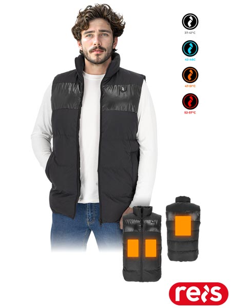 Pikowany bezrękawnik ochronny ocieplany, męski.- materiał główny: tkanina 100% nylon 40D o gramaturze 85 g/m2- wstawki: 100% poliester o gramaturze 73 g/m2- wyściółka 100% poliester o gramaturze 168 g/m2- podszewka 100% poliester o gramaturze 96 g/m2- zapinany na zamek błyskawiczny- kołnierz w formie stójki z zapięciem na napę- dwie kieszenie w dolnej części zapinane na suwak- kieszeń wewnętrzna z wodoodpornym kablem USB do podpięcia powerbanka zapinana na suwak- wodoodporne panele grzewcze (wykonane z nanorurek węglowych) z czterostopniową regulacją w dwóch strefach - plecy oraz klatka piersiowa- tryby: niska temperatura w dwóch wariantach (kolor biały 37-41°C, niebieski 42-46°C), średnia temperatura (kolor pomarańczowy 47-51°C), wysoka temperatura (kolor czerwony 52-57°C)- szacunkowy czas pracy baterii przy zastosowaniu powerbanku 10 000 mAh: minimalny czas ogrzewania wynosi około 4,5 godziny, maksymalny czas ogrzewania należy określić na podstawie środowiska zewnętrznego- zasilanie: dowolny powerbank z wyjściem USB Typ A, 5V/2-2,1A (brak w zestawie)