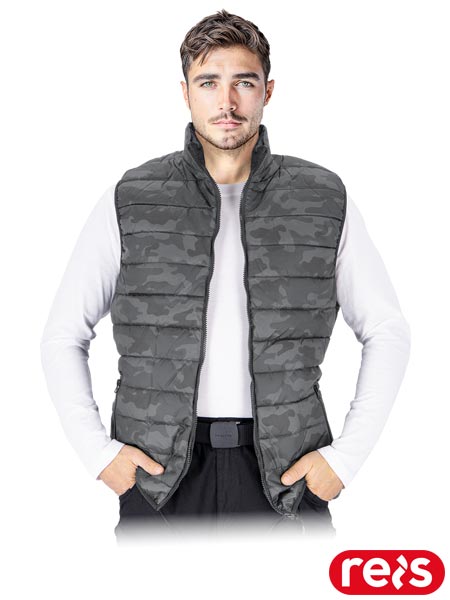 Pikowany bezrękawnik ochronny ocieplany, męski.- tkanina: 100% poliester o gramaturze 65 g/m2- wyściółka 100% poliester o gramaturze 180 g/m2- podszewka 100% poliester tafta 210T o gramaturze 55 g/m2- zapinany na zamek błyskawiczny- kołnierz w formie stójki- dwie kieszenie w dolnej części zapinane na suwak- ramiona oraz dół bezrękawnika wykończone elastyczną lamówką- fason: REGULAR