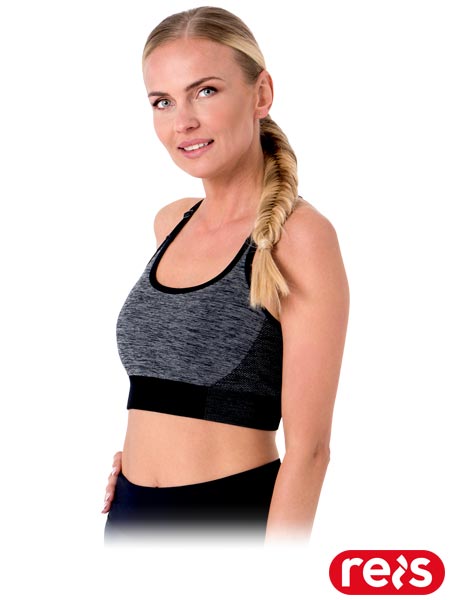 Biustonosz sportowy.- dzianina: 70% nylon, 22% poliester, 8% elastan- regulowane ramiączka- wbudowane miseczki z możliwością wyjęcia- dół biustonosza zakończony ściągaczem