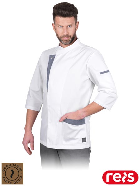 Bluza kucharska z długim rękawem, męska.- 65% poliester, 35% bawełna- gramatura 200 g/m2- zapinana na sześć zatrzasków- zewnętrzna kieszeń po prawej stronie bluzy- dodatkowa kieszeń na lewym rękawie- rękawy zakończone niewielkimi rozcięciami- zastosowanie wstawki z elastycznego materiału na plecach zapewnia komfort użytkowania- pranie w temperaturze do 60°C