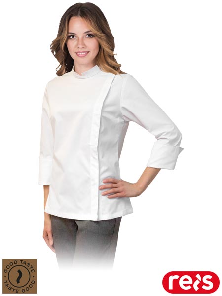 Bluza kucharska z długim rękawem, damska.- tkanina: 55% bawełna, 45% poliester T400- gramatura 190 g/m2- zapinana na osiem zatrzasków- kołnierz w formie stójki- kieszonka na długopis na patce zasłaniającej zapięcia- rękawy zakończone niewielkimi rozcięciami dzięki czemu po wywinięciu tworzą elegancki mankiet- zastosowanie wstawki z elastycznego materiału na plecach zapewnia komfort użytkowania- pranie w temperaturze do 60°C