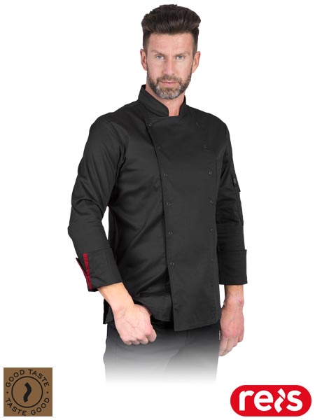 Bluza kucharska z długim rękawem, męska.- 60% bawełna, 40% poliester- gramatura 210 g/m2- zapinana na dwanaście zatrzasków- kołnierz w formie stójki- zewnętrzna kieszeń po lewej stronie bluzy- dodatkowa kieszeń na lewym rękawie zapinana na zatrzask- rękawy zakończone niewielkimi rozcięciami dzięki czemu po wywinięciu tworzą elegancki mankiet- mankiet zakończony bordową wstawką- pranie w temperaturze do 30°C