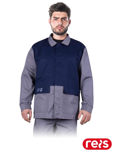 Antyelektrostatyczna bluza ochronna, chroniąca przed ciekłymi chemikaliami.- 64% poliester, 34% bawełna, 2% włókna węglowe- gramatura 250 g/m2- zapinana na napy, dodatkowo kryte plisą- kieszeń wewnętrzna po prawej stronie zapinana ne rzep- dwie kieszenie dolne kryte patką zapinaną na rzep- przeznaczona do ochrony użytkownika na stanowiskach na których występuje zagrożenie ciekłymi chemikaliami w sytuacjach potencjalnego narażenia na drobno rozpyloną ciecz lub rozbryzgi o niewielkim ciśnieniu i objętości, przed którymi nie jest wymagana całkowita bariera na przenikanie cieczy na poziomie molekularnym (Typ PB[6] odzieży) oraz do prac w środowisku, w którym wymagana jest zdolność do rozpraszania ładunku elektrostatycznego w celu zapobiegania wyładowaniom zapalającym- zgodna z normami: EN ISO 13688, EN 13034, EN 1149-5
