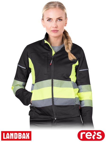 Elastyczna bluza ochronna FRAUBAX, damska.- 62% poliester, 34% bawełna, 4% elastan (spandex) o gramaturze 240 g/m2- wstawki z kontrastowego materiału 65% poliester, 35% bawełna o gramaturze 210 g/m2- zapinana na suwak- kołnierz w formie stójki- kieszeń na klatce piersiowej zapinana na suwak- dwie kieszenie po bokach w dolnej części zapinane na suwak- odblaskowe elementy na ramionach- pasy odblaskowe segmentowe zapewniają lepszą widoczność- testowane na zawartość szkodliwych dla zdrowia substancji zgodnie ze standardami OEKO-TEX® Standard 100