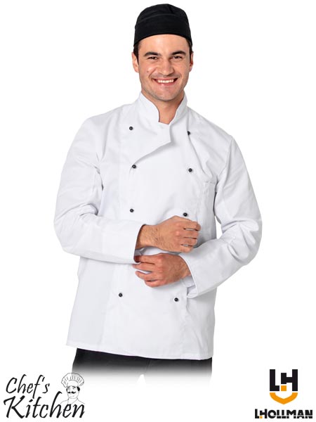 Bluza kucharska z linii Chefs Kitchen.- 65% poliestru, 35 % bawełny- gramatura 245 g/m2- odpowiednia do prania przemysłowego (maksymalna temperatura 95°C)- parametry tkaniny zwiększają skuteczność usuwania plam z odzieży- kołnierz w formie stójki- na przodzie dwa rzędy guzików LH-BUTTON, które można dowolnie wymieniać - dostępne w kilku kolorach- z lewej strony w górnej części podłużna kieszeń- rękawy zakończone niewielkimi rozcięciami dzięki czemu po wywinięciu tworzą elegancki mankiet