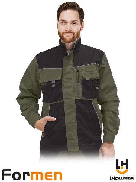 Bluza ochronna FORMEN, męska.- materiał główny: tkanina o splocie canvas 65% poliester, 35% bawełna o gramaturze 270g/m2- wstawki: tkanina 100% poliester Oxford 600D o gramaturze 240 g/m2 oraz elementy z tkaniny Cordura 100% nylon 500D o gramaturze 200 g/m2- zapinana na zamek błyskawiczny z dodatkowym zapięciem na rzepy- kołnierz w formie stójki- dwie kieszenie w dolnej części oraz pięć na klatce piersiowej z dodatkowymi wąskimi kieszonkami na przybory np. długopis- rękawy oraz dół bluzy z możliwością regulacji za pomocą nap- odblaskowe elementy- system wentylacji na plecach oraz pod pachami umożliwia cyrkulację powietrza i zwiększa komfort użytkowania- przedłużany tył bluzy- fason: REGULAR- testowana na zawartość szkodliwych dla zdrowia substancji zgodnie ze standardami OEKO-TEX® Standard 100