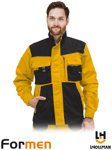 Bluza ochronna FORMEN, męska.- materiał główny: tkanina o splocie canvas 65% poliester, 35% bawełna o gramaturze 270g/m2- wstawki: tkanina 100% poliester Oxford 600D o gramaturze 240 g/m2 oraz elementy z tkaniny Cordura 100% nylon 500D o gramaturze 200 g/m2- zapinana na zamek błyskawiczny z dodatkowym zapięciem na rzepy- kołnierz w formie stójki- dwie kieszenie w dolnej części oraz pięć na klatce piersiowej z dodatkowymi wąskimi kieszonkami na przybory np. długopis- rękawy oraz dół bluzy z możliwością regulacji za pomocą nap- odblaskowe elementy- system wentylacji na plecach oraz pod pachami umożliwia cyrkulację powietrza i zwiększa komfort użytkowania- przedłużany tył bluzy- fason: REGULAR- testowana na zawartość szkodliwych dla zdrowia substancji zgodnie ze standardami OEKO-TEX® Standard 100