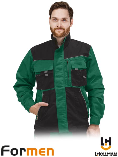 Bluza ochronna FORMEN, męska.- materiał główny: tkanina o splocie canvas 65% poliester, 35% bawełna o gramaturze 270g/m2- wstawki: tkanina 100% poliester Oxford 600D o gramaturze 240 g/m2 oraz elementy z tkaniny Cordura 100% nylon 500D o gramaturze 200 g/m2- zapinana na zamek błyskawiczny z dodatkowym zapięciem na rzepy- kołnierz w formie stójki- dwie kieszenie w dolnej części oraz pięć na klatce piersiowej z dodatkowymi wąskimi kieszonkami na przybory np. długopis- rękawy oraz dół bluzy z możliwością regulacji za pomocą nap- odblaskowe elementy- system wentylacji na plecach oraz pod pachami umożliwia cyrkulację powietrza i zwiększa komfort użytkowania- przedłużany tył bluzy- fason: REGULAR- testowana na zawartość szkodliwych dla zdrowia substancji zgodnie ze standardami OEKO-TEX® Standard 100