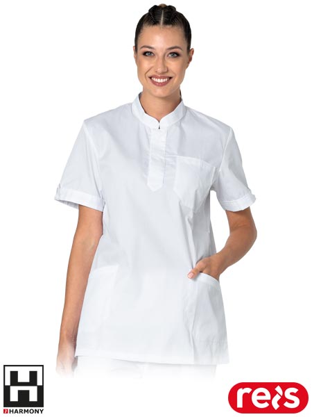 Bluza ochronna z krótkim rękawem LIRA, damska.- tkanina: 65% poliester, 35% bawełna- gramatura 150 g/m2- posiada kieszonkę na klatce piersiowej oraz dwie kieszenie boczne- kołnierz w formie stójki- dekolt zapinany na guziki- zakładana przez głowę- rękawy ozdobione guzikami- idealna dla branży kosmetycznej, medycznej, jak i chemicznej- stosowana do pracy w laboratoriach- pranie w temperaturze do 60°C
