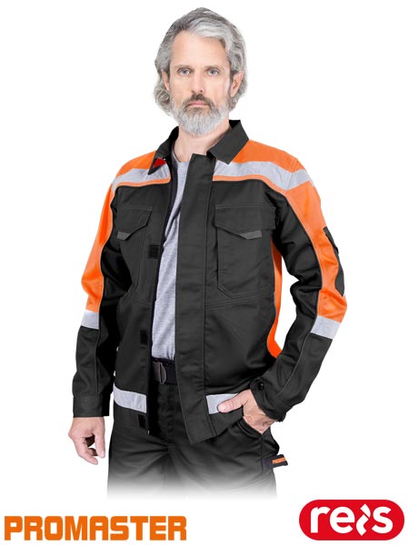 Bluza ochronna PROM, męska.- tkanina: 65% poliester, 35% bawełna o gramaturze 290 g/m2- wstawki z żółtego i pomarańczowego materiału 80% poliester, 20% bawełna- zapinana za zamek błyskawiczny z dodatkowym zapięciem na rzepy- dwie kieszenie w dolnej części oraz dwie na klatce piersiowej zapinane na rzep- na lewym rękawie kieszeń na telefon komórkowy- rękawy zakończone zapięciem na napy- dół bluzy zakończony ściągaczem w tylnej części- pasy odblaskowe zapewniające lepszą widoczność- spełnia wymagania normy EN ISO 20471* (dotyczy pasów) oraz EN ISO 13688