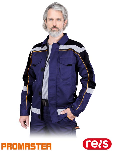 Bluza ochronna PROM, męska.- tkanina: 65% poliester, 35% bawełna o gramaturze 290 g/m2- wstawki z żółtego i pomarańczowego materiału 80% poliester, 20% bawełna- zapinana za zamek błyskawiczny z dodatkowym zapięciem na rzepy- dwie kieszenie w dolnej części oraz dwie na klatce piersiowej zapinane na rzep- na lewym rękawie kieszeń na telefon komórkowy- rękawy zakończone zapięciem na napy- dół bluzy zakończony ściągaczem w tylnej części- pasy odblaskowe zapewniające lepszą widoczność- spełnia wymagania normy EN ISO 20471* (dotyczy pasów) oraz EN ISO 13688