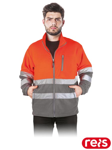 Bluza ochronna, męska.- dzianina polarowa: 100% poliester- gramatura 280 g/m2- zapinana na zamek błyskawiczny- kołnierz w formie stójki- dwie kieszenie w dolnej części oraz jedna na klatce piersiowej zapinane za suwak- rękawy wykończone elastyczną lamówką- pasy odblaskowe zwiększające widoczność- spełnia wymogi normy EN ISO 20471 (klasa 2)
