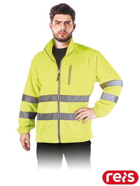 Bluza ochronna, męska.- dzianina polarowa: 100% poliester- gramatura 280 g/m2- zapinana na zamek błyskawiczny- kołnierz w formie stójki- dwie kieszenie w dolnej części oraz jedna na klatce piersiowej zapinane za suwak- rękawy wykończone elastyczną lamówką- tkanina we fluorescencyjnym kolorze i pasy odblaskowe zwiększające widoczność- fason: REGULAR