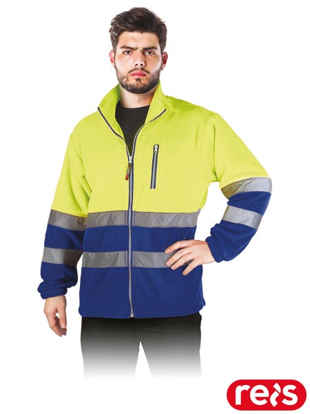 Bluza ochronna, męska.- dzianina polarowa: 100% poliester- gramatura 280 g/m2- zapinana na zamek błyskawiczny- kołnierz w formie stójki- dwie kieszenie w dolnej części oraz jedna na klatce piersiowej zapinane za suwak- rękawy wykończone elastyczną lamówką- pasy odblaskowe zwiększające widoczność- spełnia wymogi normy EN ISO 20471 (klasa 2)