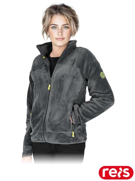 Bluza ochronna, damska.- dzianina polarowa coral: 100% poliester- gramatura 290 g/m2- zapinana na zamek błyskawiczny- kołnierz w formie stójki- dwie kieszenie w dolnej części zapinane na suwak- rękawy oraz dół bluzy wykończone elastyczną lamówką- fason: REGULAR