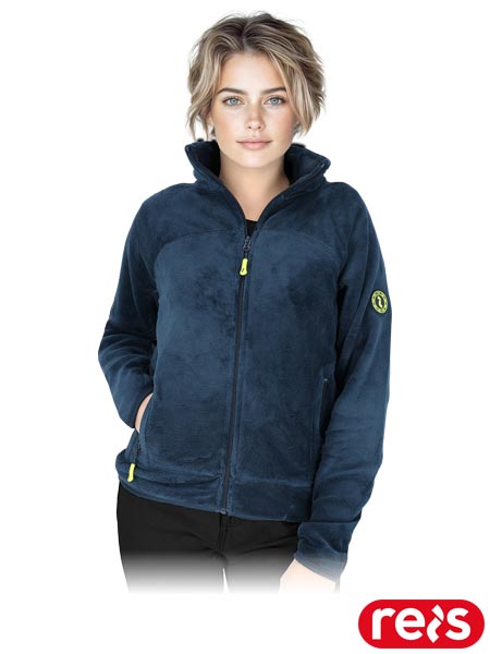 Bluza ochronna, damska.- dzianina polarowa coral: 100% poliester- gramatura 290 g/m2- zapinana na zamek błyskawiczny- kołnierz w formie stójki- dwie kieszenie w dolnej części zapinane na suwak- rękawy oraz dół bluzy wykończone elastyczną lamówką- fason: REGULAR
