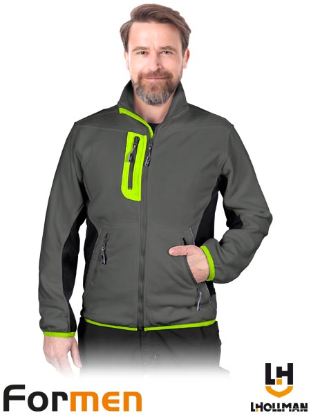 Bluza ochronna, męska.- dzianina polarowa: 100% poliester- gramatura 280 g/m2- zapinana na zamek błyskawiczny- kołnierz w formie stójki- dwie kieszenie w dolnej części oraz jedna na klatce piersiowej zapinane na suwak- rękawy oraz dół bluzy wykończone elastyczną lamówką
