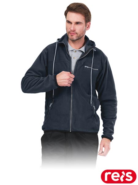 Bluza ochronna, męska.- dzianina polarowa: 100% poliester- gramatura 280 g/m2- zapinana na zamek błyskawiczny- kaptur ściągany na troczki- dwie kieszenie w dolnej części oraz jedna na klatce piersiowej zapinane na suwak- rękawy oraz dół bluzy wykończone elastyczną lamówką