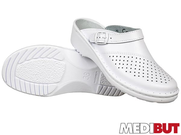 Klapki z przeciwpoślizgowym spodem.- perforowana cholewka skórzana z odkrytą piętą- regulacja tęgości- cholewka doszyta do spodu zewnętrznym ściegiem- obuwie z paskiem dwu-funkcyjnym, przekładanym na piętę- spód przeciwpoślizgowy z anatomicznym profilem ortopedycznym, wykonany z ekspandowanego poliuretanu, wysokość spodu pod stopą 1,5-2 cm, wysokość spodu pod piętą 3,5-4 cm- pełny profil ortopedyczny- wyściółka skórzana- spełniają wymagania normy EN ISO 20347