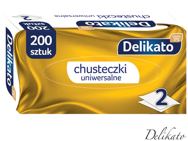 Chusteczki kosmetyczne Delikato.- 2 warstwy x 14,5 g/m2- 100% celuloza- kolor biały- składane- wymiary chusteczki: 20x20 cm- małe opakowanie 200 szt. chusteczek