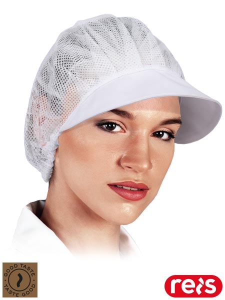 Czapka kucharska z daszkiem.- siateczka: dzianina 100% poliester o gramaturze 65 g/m2- daszek: tkanina 65% poliester, 35% bawełna o gramaturze 190 g/m2- przedłużany siateczkowy tył zabezpiecza włosy przed przedostaniem się na zewnątrz- przepuszcza powietrze, dzięki czemu skóra głowy oddycha- pranie w temperaturze do 30°C