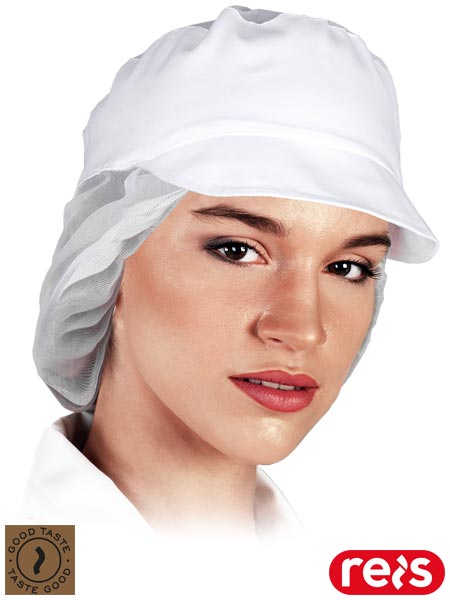 Czapka kucharska z daszkiem.- daszek oraz materiał wokół głowy: tkanina 65% poliester, 35% bawełna o gramaturze 190 g/m2- siateczka: tkanina 100% poliester o gramaturze 30 g/m2- wymiary: na płasko 25,5 cm, po rozciągnięciu 29 cm- przedłużany siateczkowy tył zabezpiecza włosy przed przedostaniem się na zewnątrz- przepuszcza powietrze, dzięki czemu skóra głowy oddycha- pranie w temperaturze do 40°C