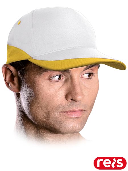 Czapka z daszkiem.- tkanina: 100% bawełna- waga sztuki około 260 g- usztywniany daszek i przód czapki- zapinana na rzep- 5-panelowa z szerokim panelem czołowym doskonałym do zdobienia- dostępna w białym kolorze z kolorowymi wstawkami co pozwala na dopasowanie czapki do różnych kolorów odzieży
