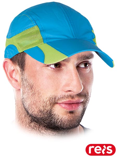 Czapka z daszkiem.- tkanina: 100% poliester- gramatura 260 g/m2- usztywniany daszek- zapinana na zatrzask z możliwością regulacji- wstawki wykonane z siatki zwiększają komfort użytkowania- idealna na upalne dni