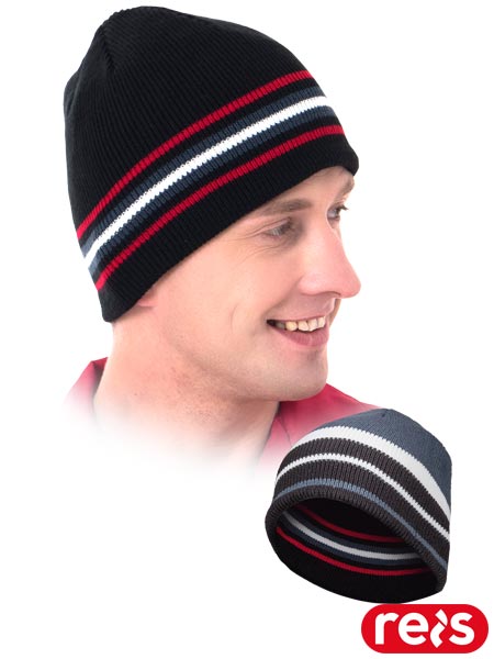 Czapka zimowa dwustronna.- dzianina: 100% przędza akrylowa- waga sztuki około 90 g- wymiary: na płasko 21 cm, po rozciągnięciu 34 cm- sprawdza się nie tylko zimą, ale również późną jesienią czy też wczesną wiosną- drugi wzór po odwróceniu czapki na drugą stronę