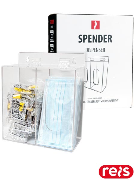 Podwójny dyspenser.- wykonany z akrylu o grubości 3 mm- wymiary z mocowaniem: 20x10x24 cm- wyposażony w dwie komory- zamykany od góry- polecany do stosowania na maseczki, czepki, fartuchy polipropylenowe, ochronniki butów czy rękawice jednorazowe- dwie możliwości mocowania w zestawie - na śruby oraz na uchwyty samoprzylepne